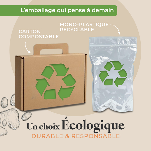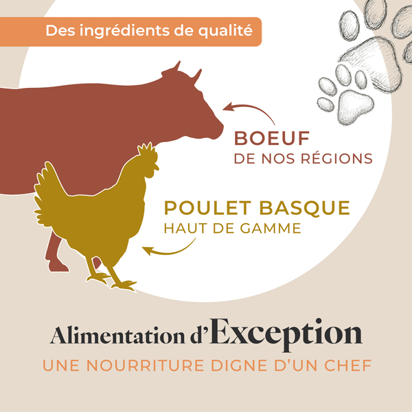 Recette unique élaborée à base de viandes fraiches française, d’os charnus et d’abats, de poulet basque d’exception et de délicieux morceaux de saumon, enrichie de compléments alimentaires naturels à base de poudre de chanvre et de levure de bière.