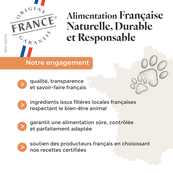 Alimentation déshydratée élaborée en France dans nos ateliers.